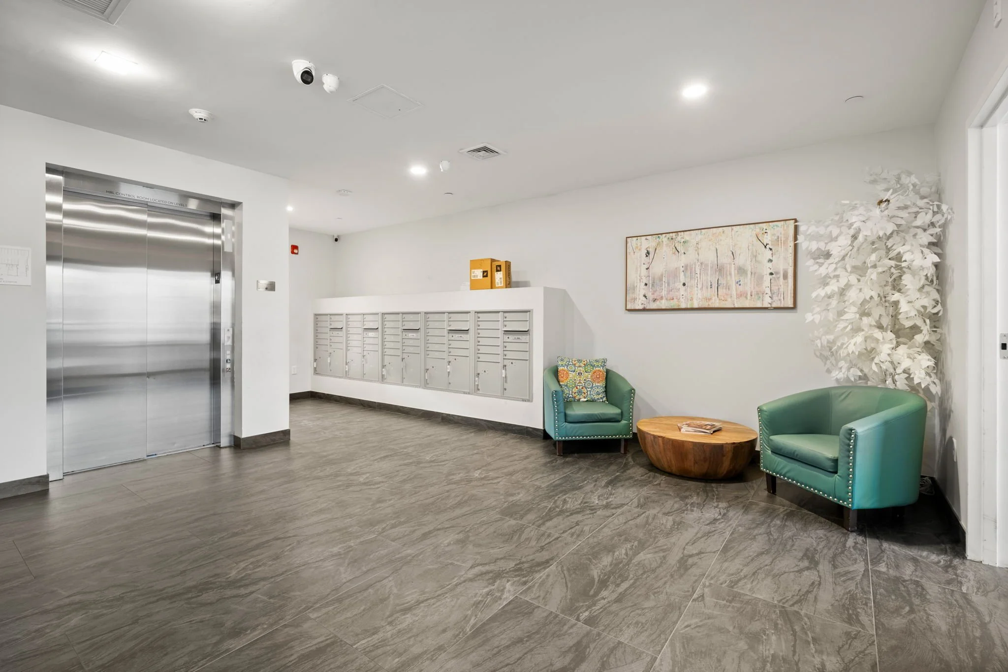 Gain access to the lobby through the secure ButterflyMX system. A package room, mailboxes, and seating area round out this space.